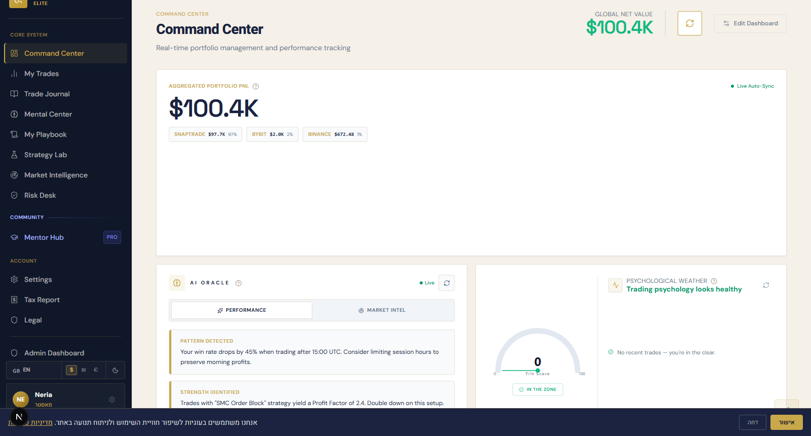 | פיצ׳ר | TraderSync $50/mo | Edgewonk $197/yr | NeuroTrade פרו ₪129/mo ✓ |